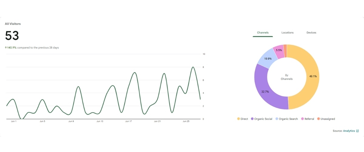 Og fordi vi ikke annoncerer eller betaler for synlighed, er det her de tal, vi synes er de sjoveste at følge. Ikke fordi vi bliver rige af dem – men fordi de viser, om der overhovedet er hul igennem. Om nogen overhovedet finder os. Og selvfølgelig også helst klikker.