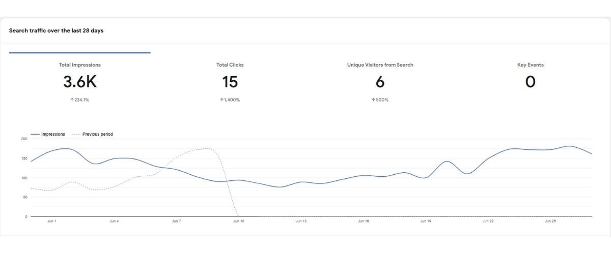 Google har vist os frem 3.600 gange. Vi er blevet klikket på 15 gange (hvilket er 1.400 % mere end sidst – igen, kontekst er alt), – og hele 6 mennesker har fundet os via søgning. Seks!