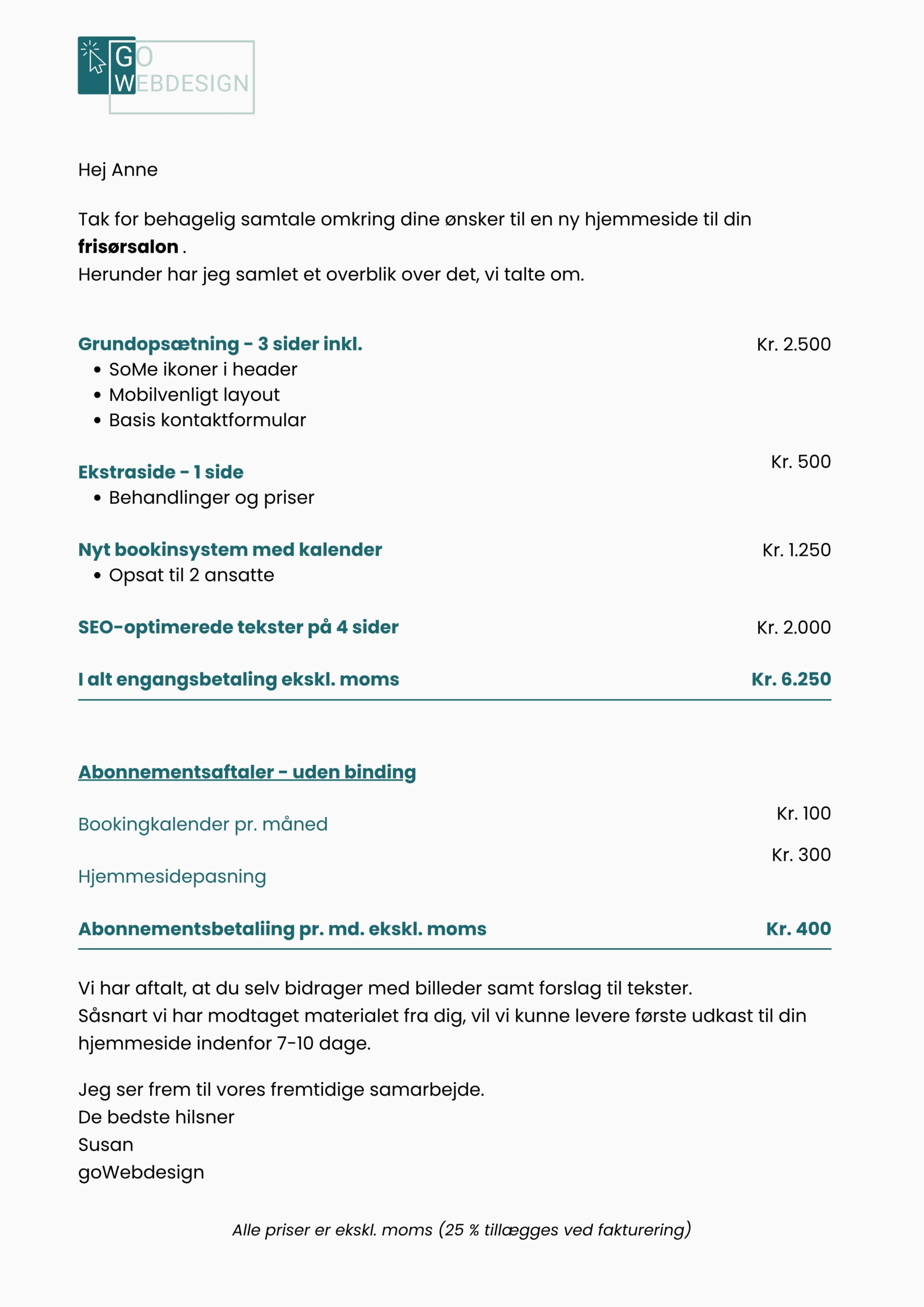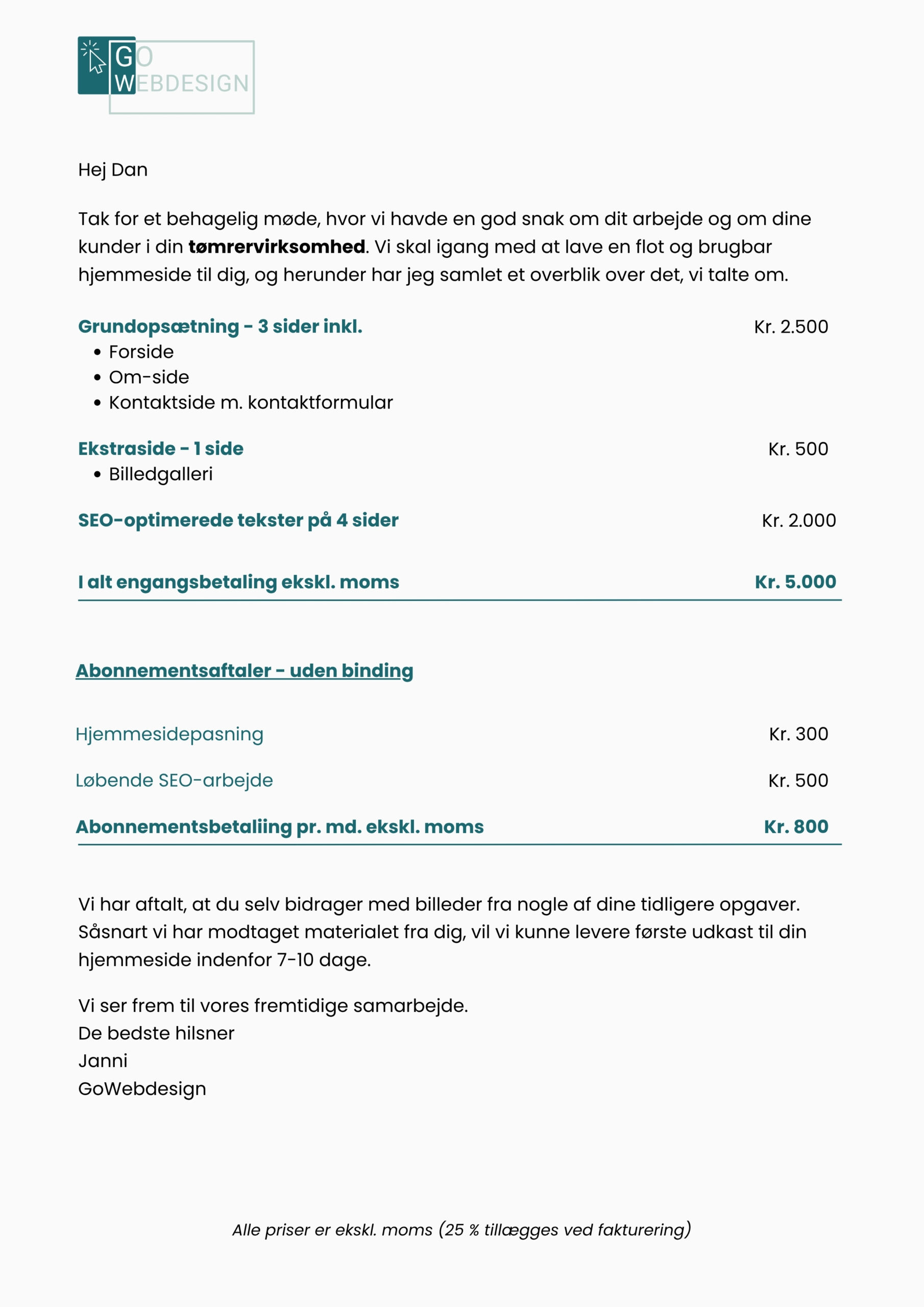Du ser, hvad det cirka koster – og vi snakker sammen, hvis noget ændrer sig. Ingen ninja-tillæg.